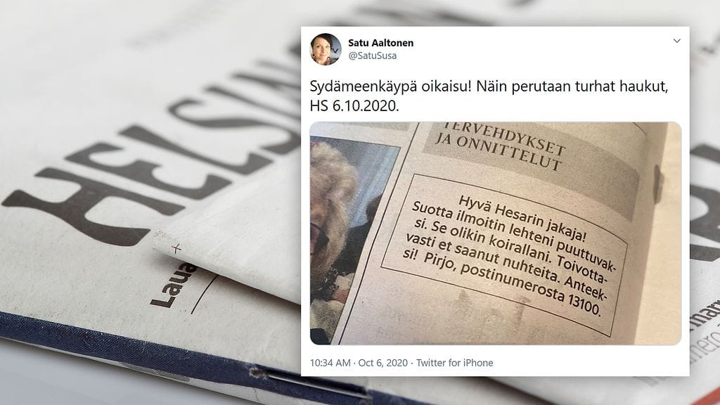 Hämeenlinnalainen Pirjo halusi pyytää ilmoituksellaan anteeksi Hesarin jakajalta, kun hän oli ilmoittanut lehtensä puuttuvaksi.