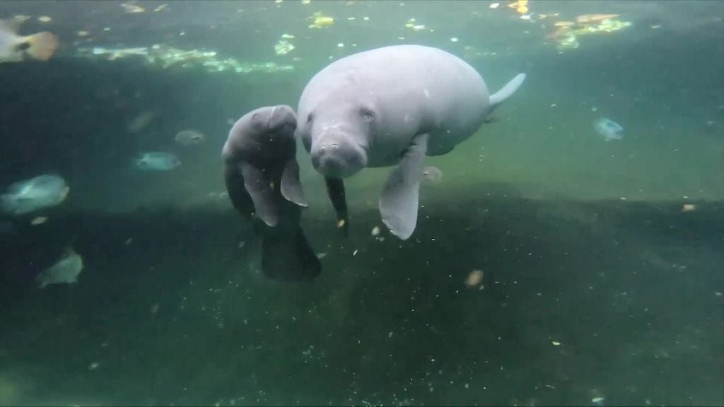 Eläintarhasta otetulta videomateriaalilta on nähtävissä, kuinka suloinen poikanen uiskentelee emonsa kanssa altaassa tyytyväisenä.
