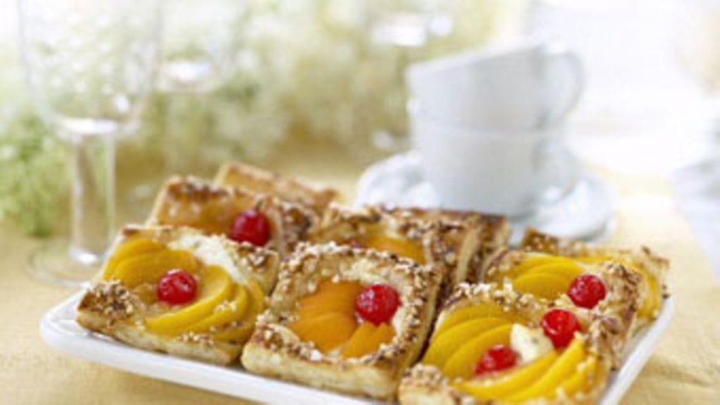 Jaa hieman sulaneet taikinalevyt kahtia. Nosta taikinaneliöt uunipellille leivinpaperin päälle väljästi. Voitele neliöt munalla, ripottele päälle kauttaaltaan mantelirouhetta ja raesokeria. Laita jokaiselle neliölle viipaloitu persikan puolikas ja kirsikka. Paista 225-asteisen uunin keskitasolla n. 15 min kauniin värisiksi. Vaihtelua saat laittamalla persikkaviipaleiden alle hieman paistonkestävää marmeladia, marsipaania tai sinihomejuustoa.