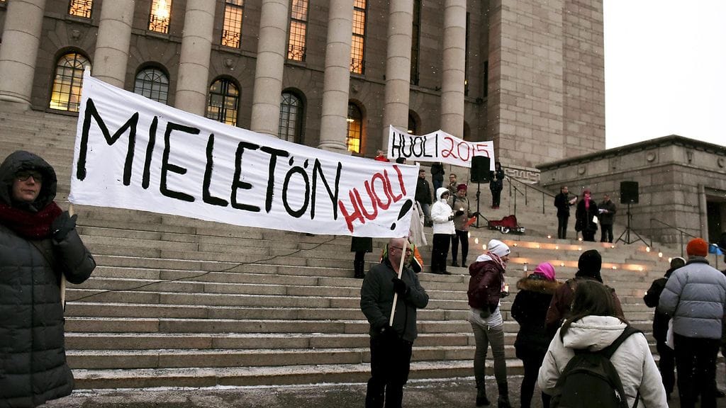 Eduskuntatalolla järjestettiin tiistaina Huoli2015 -kampanjan mielenosoitus psykiatrisen sairaanhoidon säästöjä vastaan.
