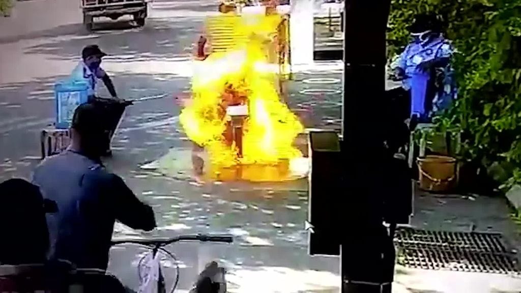 Intiassa sattui hengenvaarallinen onnettomuus, kun moottoripyöräilijän ylle suihkutettu desinfiointiaine sytytti tulipalon, jonka liekeistä motoristi joutui pelastautumaan. Hurja tilanne tallentui valvontakameraan.