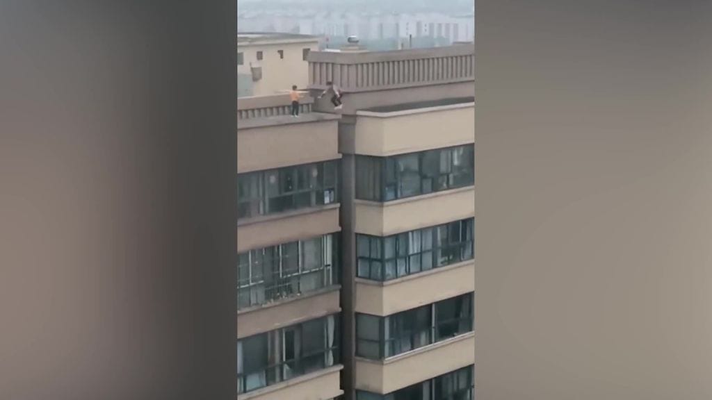 Kaksi poikaa hyppi katolta toiselle 27-kerroksisen talon katolla. Video on kuvattu Xianningin kaupungissa Kiinassa.
