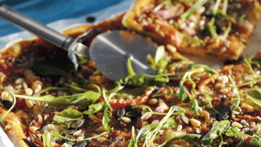 Paista pizzaa 225 asteessa 15-20 minuuttia, kunnes pizza on saanut väriä. Mausta oreganolla. Levitä pizzan päälle revityt rucolanlehdet ja paahdetut siemenet.
