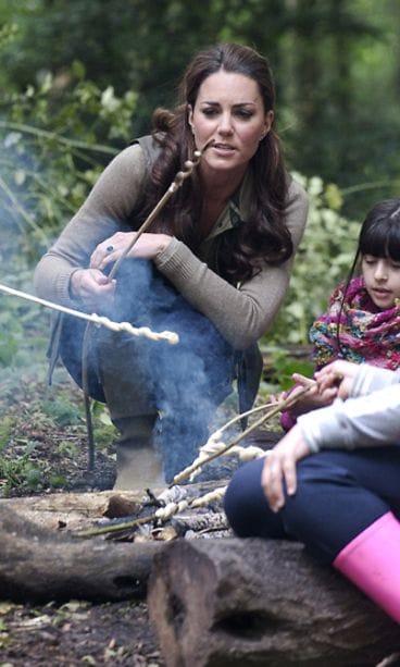 Leirin aktiviteetteihin, kuten makkaranpaistoon ja teltankokoamiseen, osallistunut Catherine nautti selvästi olostaan lasten seurassa. Alkaako herttuatar potea jo vauvakuumetta?