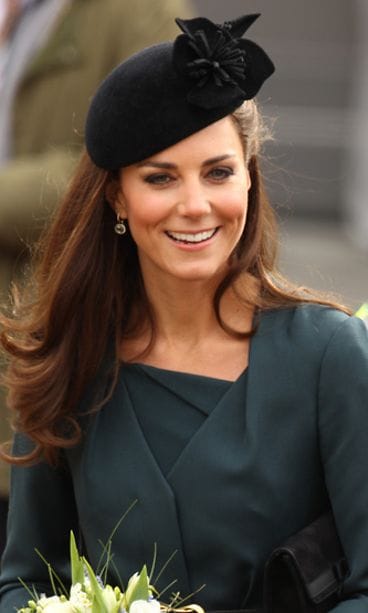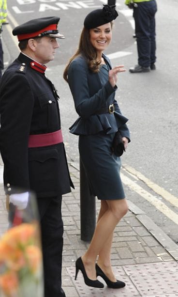 Iso-Britannian tuleva kuningatar Catherine, 30, edusti upeassa 1940-luvun eleganssia hohkavassa jakkupuvussa, joka korosti naisen hoikkaa uumaa ja kauniita sääriä. Siniharmaa jakku on L.K. Bennettin käsialaa, tyylikäs hattu puolestaan James Lockin.