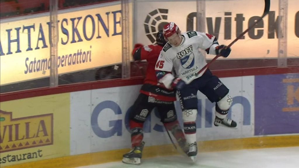 Avauserää oli pelaamatta noin kuusi ja puoli minuuttia, kun päädystä kiekko hakenut Barach sai HIFK:n Micke-Max Åstenin taklauksen selkäänsä.
