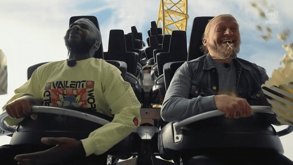 Mies astui vuoristoratakärryyn yhdessä juontaja Jarppi Leppälän kanssa, joka pyysi tätä kertomaan viisi syytä, miksi Suomi on hyvä maa.