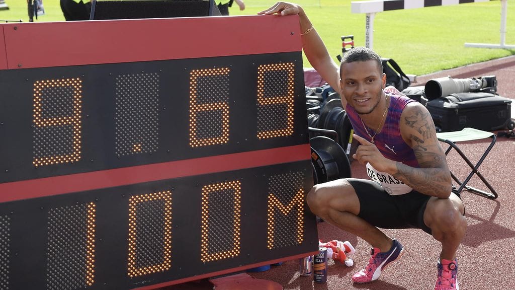 De Grasse pyyhälsi myötätuulen avittamani 100 metriä huikeaan aikaan 9,69. Tulos ei ollut tilastokelpoinen, sillä myötätuulta oli juoksun aikana 4,8 metriä sekunnissa.