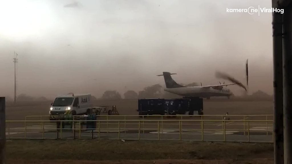 São Paulossa Ribeirão Preton kunnassa tallentui kameraan uskomaton hetki, kun myrsky onnistui liikuttamaan paikallisen lentokentän irtaimistoa ja jopa lentokoneita pois paikoiltaan.