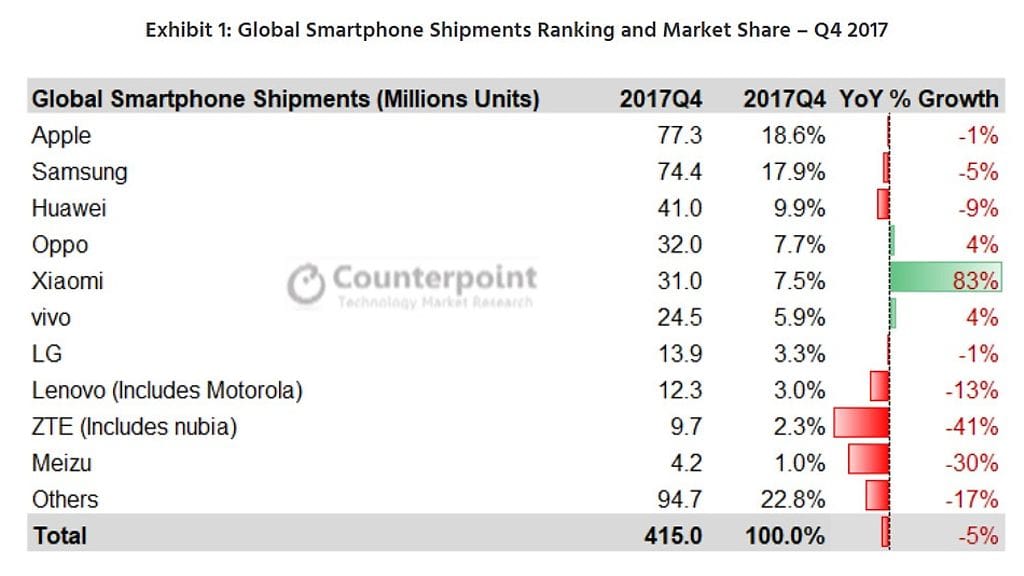 Loppuvuonna maailmassa toimitettiin yhteensä Counterpointin mukaan 415 miljoonaa älypuhelinta, joten Nokia-älypuhelinten toimitukset olivat noin 4 miljoonaa puhelinta.