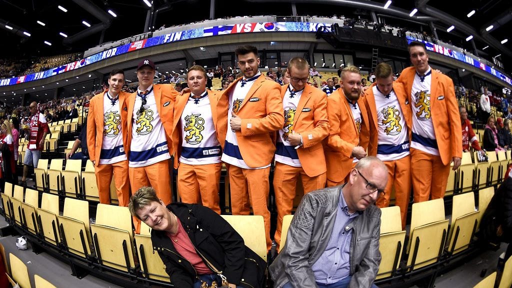 Kahdeksan suomalaismiehen faniporukka kerää jääkiekon MM-kisoissa erityisen paljon huomiota. Huomioväri on Hockey Nightista tuttu oranssi.