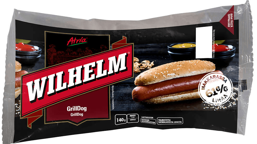 Wilhelm-välipalauutuus on markkinoiden ensimmäinen premium-hodari. Seesaminsiemensämpylän välissä aito ja reilunkokoinen Wilhelm-grillibalkan puhuttelee laatutietoisia kuluttajia. Grillibalkanin lihapitoisuus 61 %.