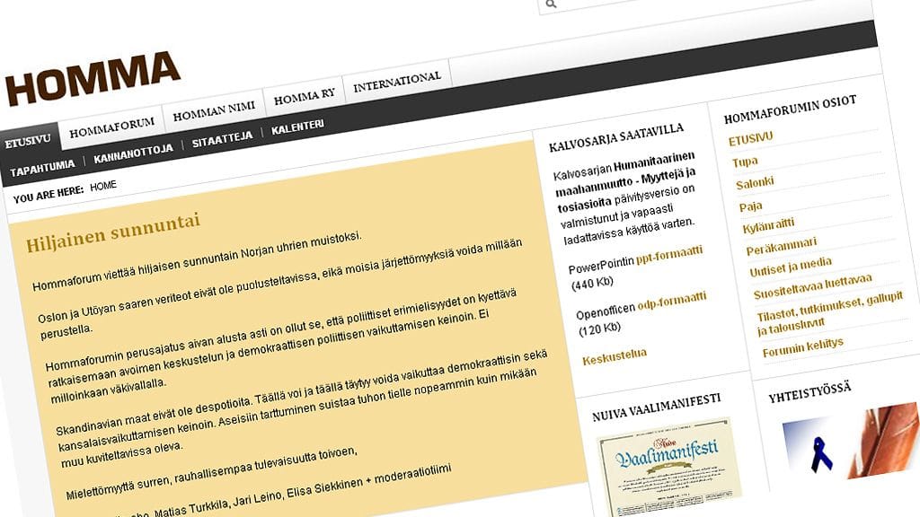 Hommaforumin etusivulla olevassa viestissä todetaan, että Oslon ja Utöyan saaren veriteot eivät ole puolusteltavissa.