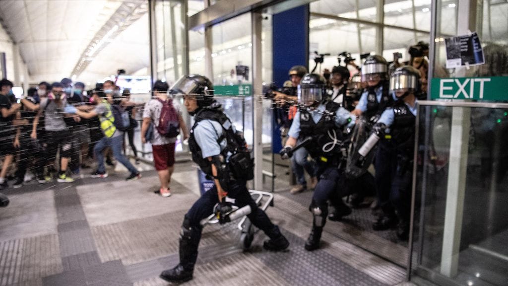 Illalla lentokentälle saapui myös mellakkapoliiseja. Paikalla ollut AFP:n toimittaja kertoi, että mellakkapoliisit käyttivät paprikasumutetta mielenosoittajia vastaan. Britannian yleisradioyhtiö BBC:n mukaan mielenosoittajat piirittivät ainakin kolme miestä. BBC:n tietojen mukaan piiritetyillä olisi ollut Manner-Kiinan poliisin henkilökortit. Hongkongin poliisi on myöntänyt, että se on soluttanut valeasuisia virkamiehiä mielenosoitusten keskelle.