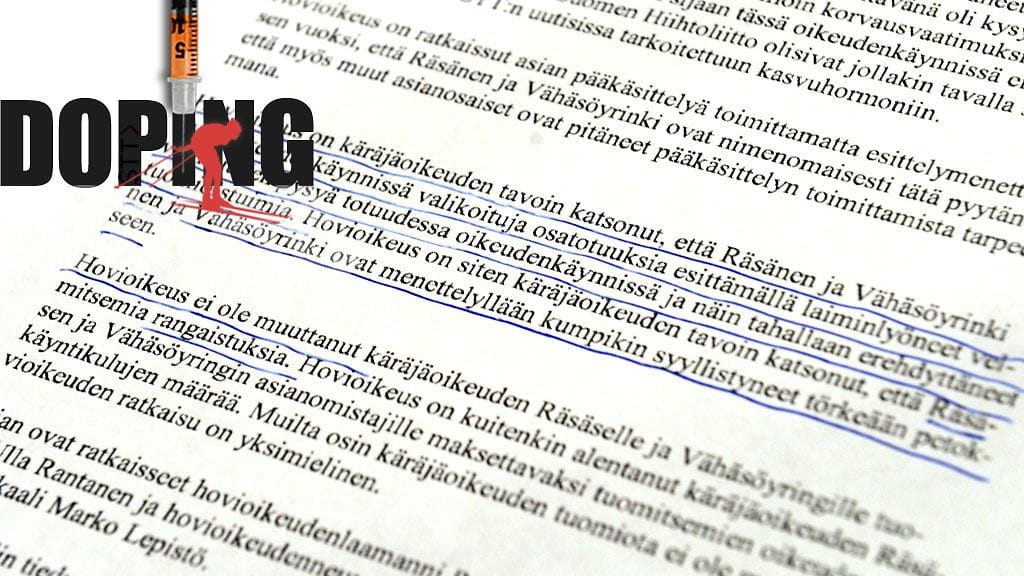 Helsingin hovioikeus ei ole muuttanut kärjäoikeuden ratkaisua hiihdon dopingjutussa. Hovioikeus katsoi käräjäoikeuden tavoin, että ex-hiihtäjä Jari Räsänen ja ex-hiihtovaikuttaja Pekka Vähäsöyrinki ovat esittäneet valikoituja osatotuuksia ja tahallaan erehdyttäneet tuomioistuimia.