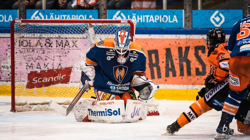 Tehokkaasti pudotuspeleissä esiintynyt HPK-pakki Petteri Nikkilä tulitti vierailijat komeasti tasoihin ylivoimalla.