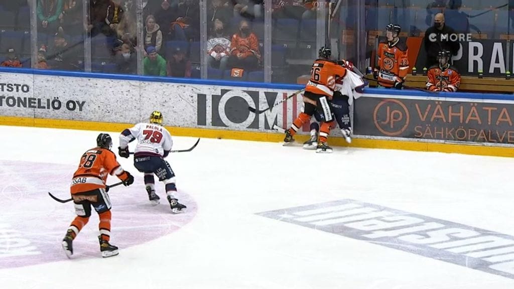 Tikka taklasi alkuminuuteilla entistä joukkuetoveriaan Jere Innalaa kyseenalaiselta vaikuttaneessa tilanteessa.