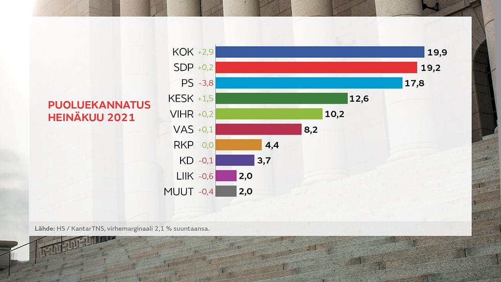 Kolmanneksi suosituin puolue on opposition perussuomalaiset, jota tukee 17,8 prosenttia vastaajista. Puolueen kannatus laski 3,8 prosenttiyksikköä.