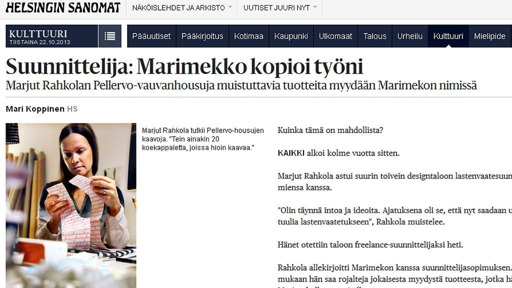 Marimekko ei kysynyt suunnittelijalta lupaa uuteen malliin, joka on Rahkolan mukaan lähes täydellinen kopio hänen housumallistaan. Rahkola kaipaa yhtiöltä eettistä vastuuta.