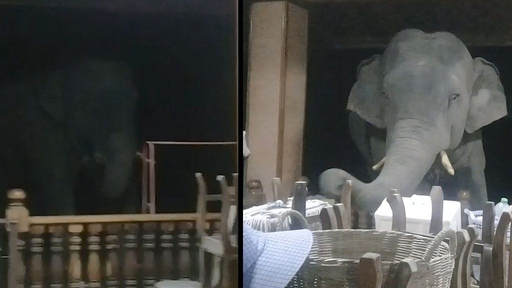 Tilanne muuttui jännittäväksi, kun elefantti päätti kävellä lähemmäksi perheen taloa. Eläin nosti kärsänsä patiolle ruoan löytämisen toivossa.