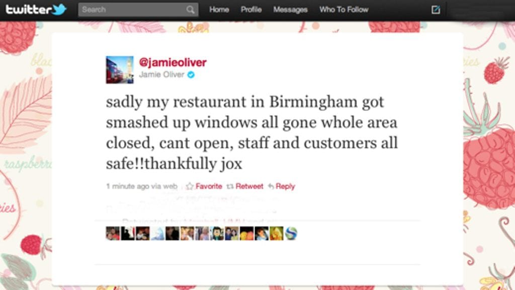 Huippukokki Jamies Oliver on paljastanut Twitter-palvelussa, että hänen Birminghamissa sijaitseva ravintolansa on tuhoutunut Englannin mellakoissa.