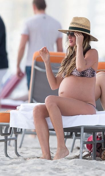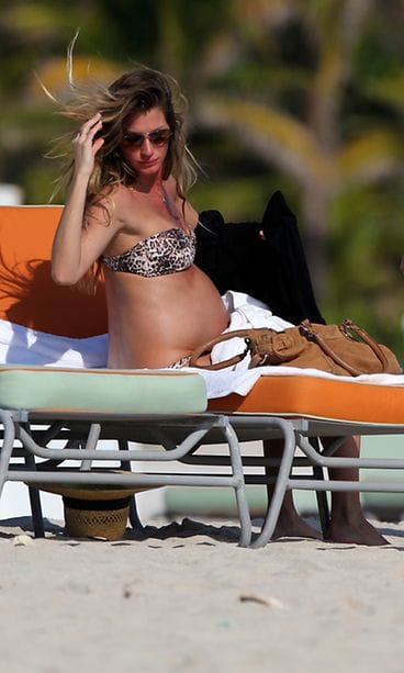 Toista lastaan odottava huippumalli Gisele Bündchen nautti olostaan Miamin auringon alla. Leopardibikineihin sonnustautuneen mallin vauvamasu on jo hervottoman kokoinen.