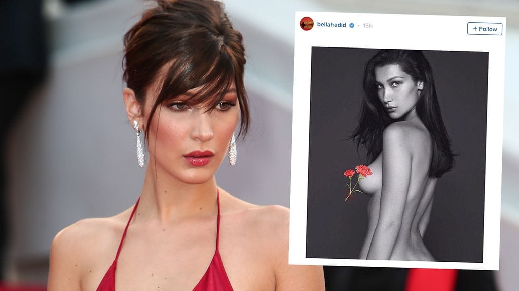 Hadid julkaisi yhden kuvista myös Instagram-tilillään. Instagramin säännöissä lukee, ettei kuvissa saa näkyä alastomuutta, joten Hadid on peittänyt rintansa hennolla kukkasella.