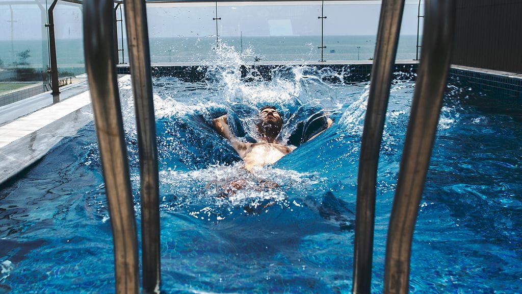 Videolla isä valmistautuukin hyppyyn uima-altaan reunalla, mutta lopputulos on kaukana täydellisestä suorituksesta.