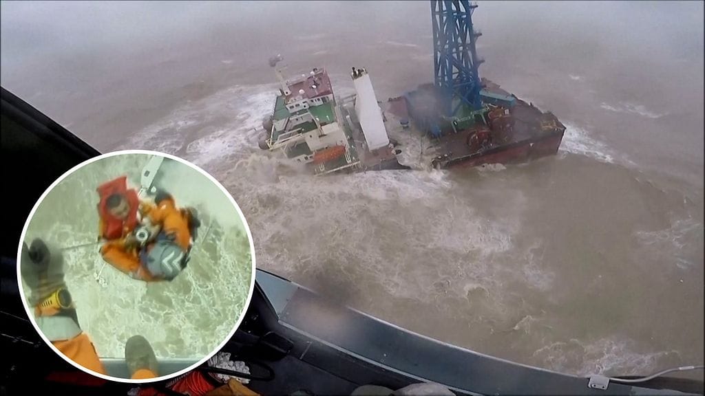 Huoltoalus upposi Hong Kongin lähistöllä trooppisessa hirmumyrskyssä. Pelastusviranomaiset julkaisivat dramaattisen videon miehistön pelastuksesta uppoavalta laivalta.
