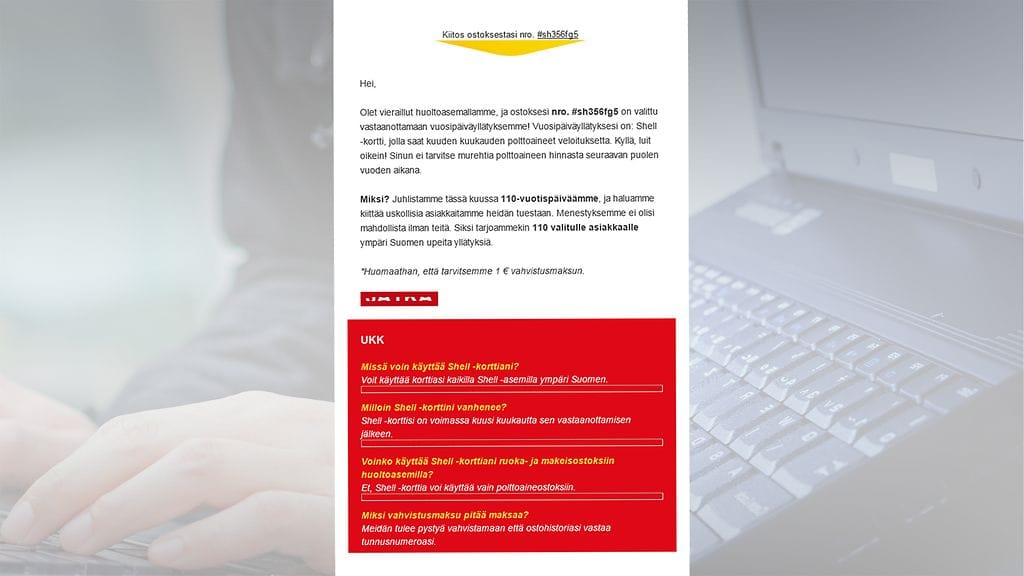 Suomalaiset ovat saaneet sähköpostiviestejä, joissa viestin vastaanottajalle kerrotaan henkilön voittaneen puolen vuoden ilmaiset polttoaineet Shellin juhlavuoden kunniaksi. Huijausviesti on kirjoitettu hyvin ja se näyttää aidolta.
