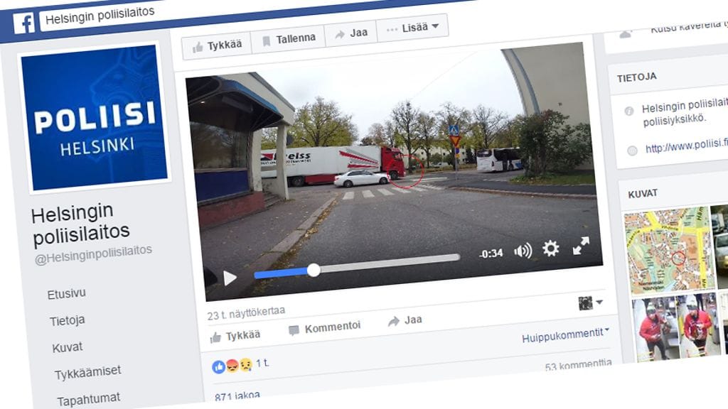Käpylässä Koskelantiellä kuvatulla videolla nähdään, kuinka suojatien eteen on pysähtynyt kuorma-auto. Viereistä kaistaa tuleva taksikuski kuitenkin ohittaa kuorma-auton pysähtymättä.