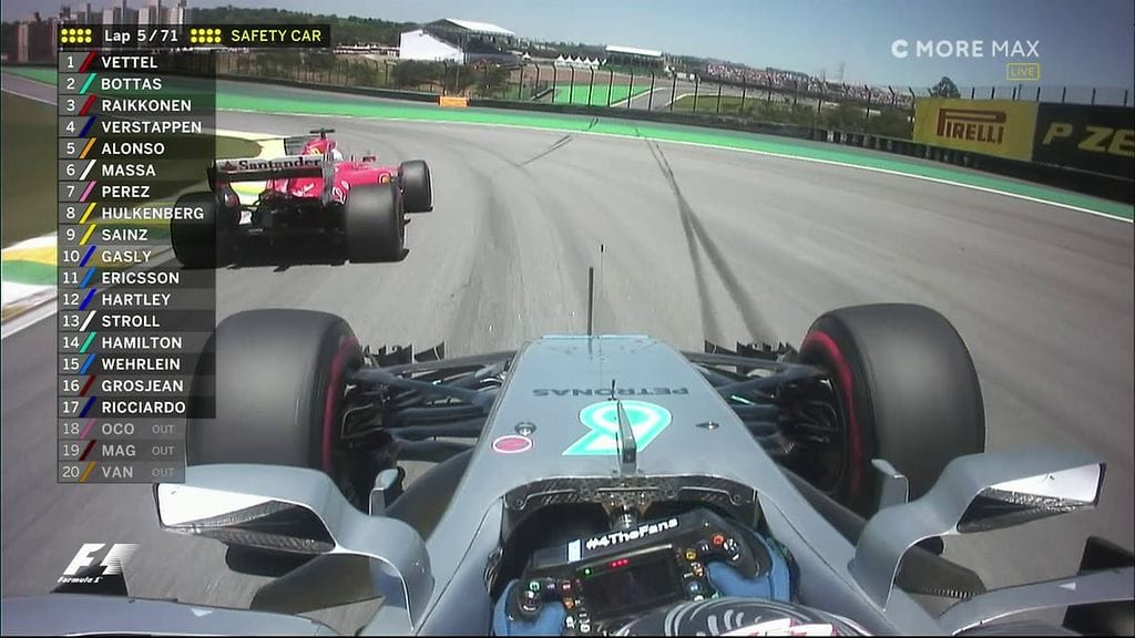 Sebastian Vettel pystyi kärkimiehenä määrittelemään tahdin, kun Brasilian F1-kisa käynnistettiin uudelleen turva-auton poistuttua radalta. Valtteri Bottakselle saksalaisen seuraaminen oli äärimmäisen hankalaa.