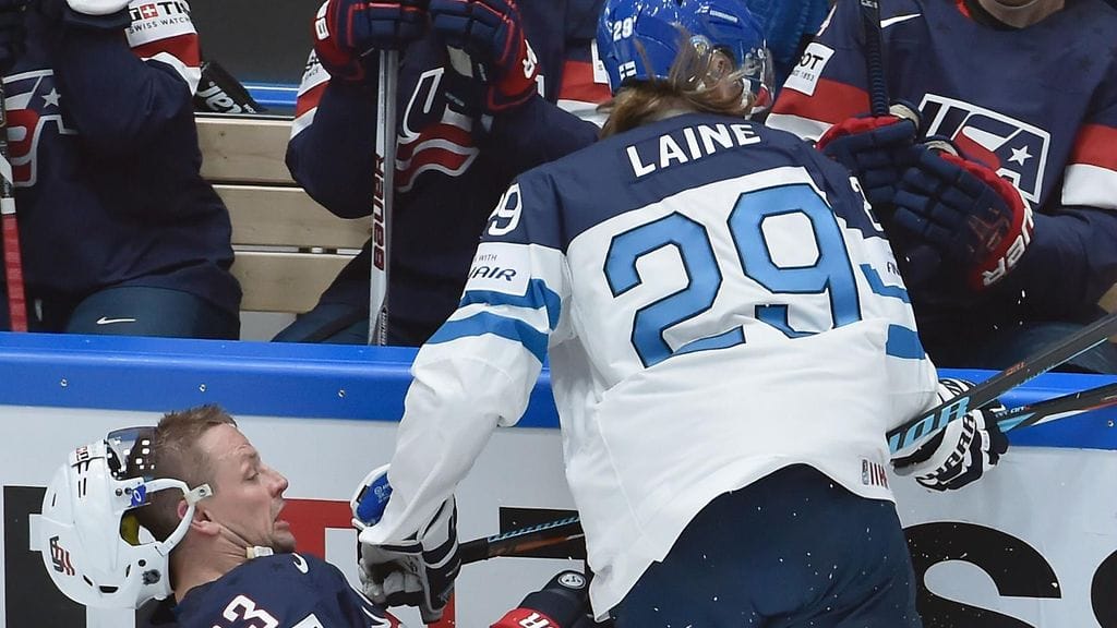Laine antoi ottelussa kunnon pusun Yhdysvaltain kapteenille Matt Hendricksille.