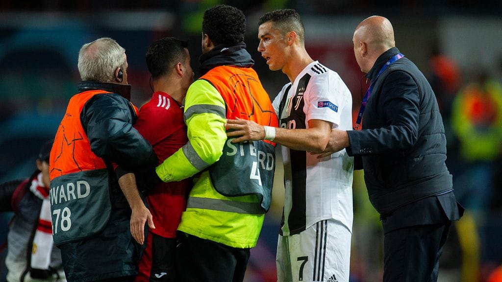 Cristiano Ronaldo joutui fanin yllättämäksi Old Traffordin nurmella jalkapallon Mestarien liigan ottelun jälkeen tiistaina.