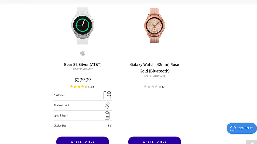 Samsungin sivuilla tulevasta älykellosta nähtiin vain yksi versio, ruusukultaisena Rose Gold -värinä 42 millimetrin koossa. Aiempien viranomaispaljastusten perusteella Galaxy Watch on tulossa kahdessa koossa, joiden näyttöjen koot ovat 1,2 ja 1,3 tuumaa.