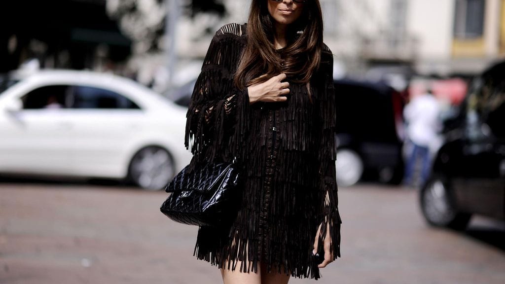 Hapsutetut mokkanahkatakit näyttävät hyvältä esimerkiksi kokovalkoisen asun, leveälahkeisten farkkujen ja boheemien kukkamekkojen parina. Hapsut piristävät myös kokomustaa asua.