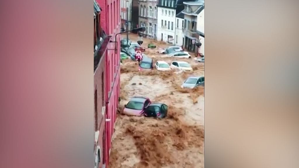 Vallonian alueella sijaitsevassa Dinantin kaupungissa tallentui videolle hurja hetki, kun tulva pyyhkäisi mukaansa henkilöautoja kadun varrelta.