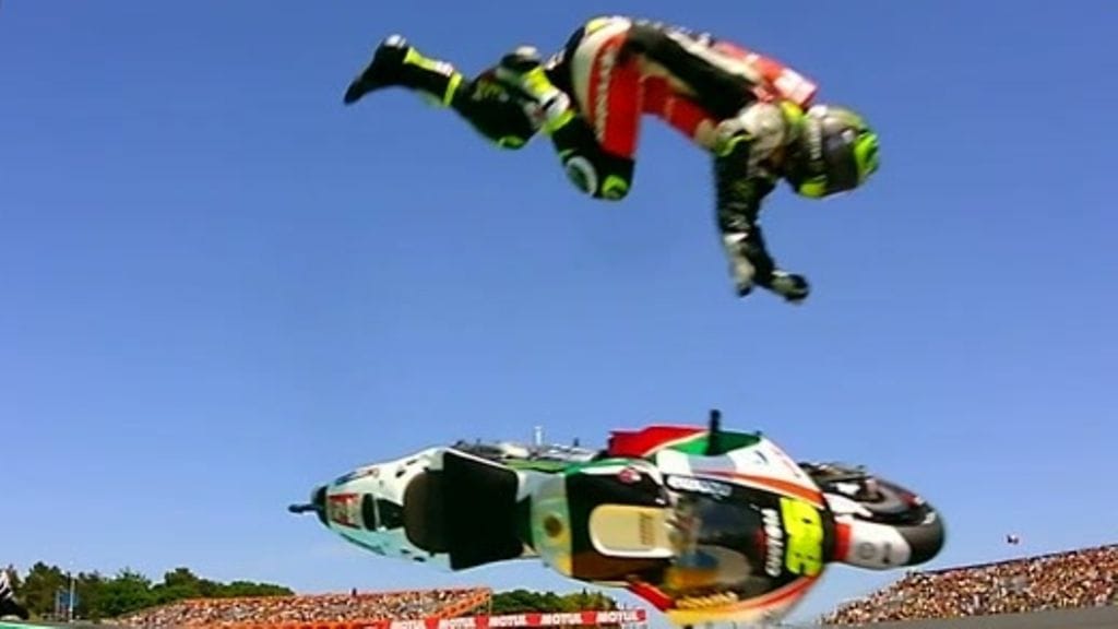 MM-sarjaa alkukaudesta johtanut Cal Crutchlow lennähti pyöränsä selästä ja laskeutui korkean ilmalennon jälkeen asfalttiin. Brittikuljettajan epäonneksi pyörä jatkoi matkaansa ja ajautui maassa olevan Crutchlow'n niskaan. Tallin tiedotteen mukaan Crutchlow'n tila on vakaa.