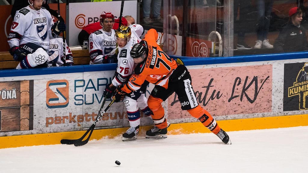 Kauden ensimmäistä otteluaan HPK-paidassa pelaava Kristian Vesalainen iski kiekon komealla tavalla HIFK:n verkkoon.