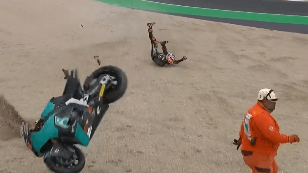 Vaarallisin tilanne nähtiin, kun Xavi Vierge kaatui hiekalle ja espanjalaisen perässä tullut tallikaveri Jake Dixon meni myös nurin. Dixon kaatui kovasta vauhdista ja pyörä sinkoutui päin Viergen pyörän kimpussa olleita ratavirkailijoita.