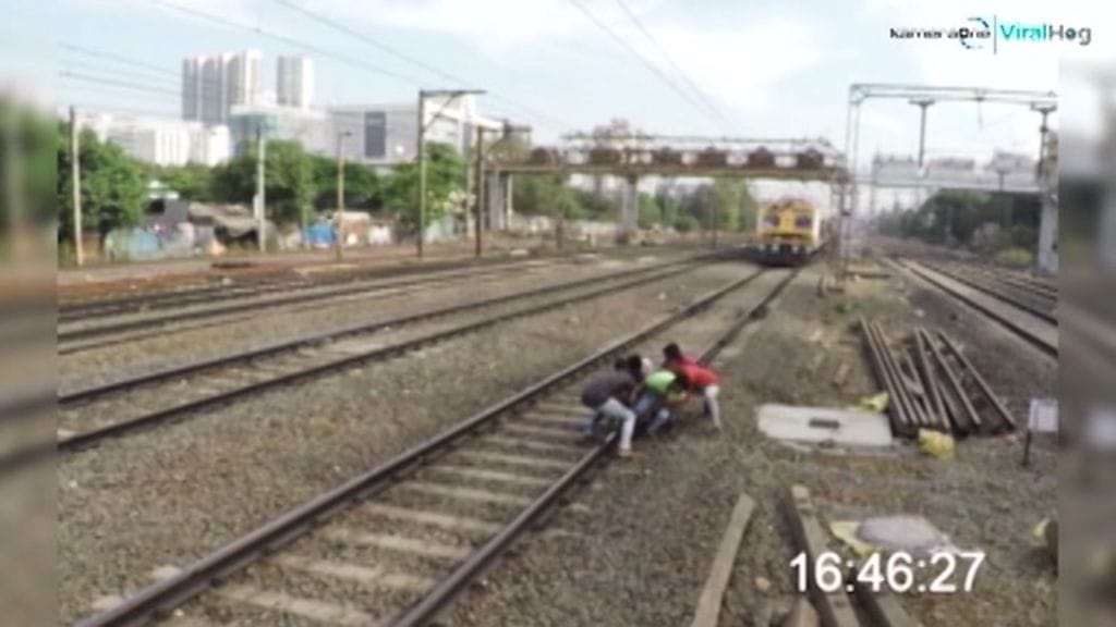 Tämä äärimmäinen läheltä piti -tilanne tallentui junarataa kuvaavalle turvakameralle Mumbaissa Intiassa.