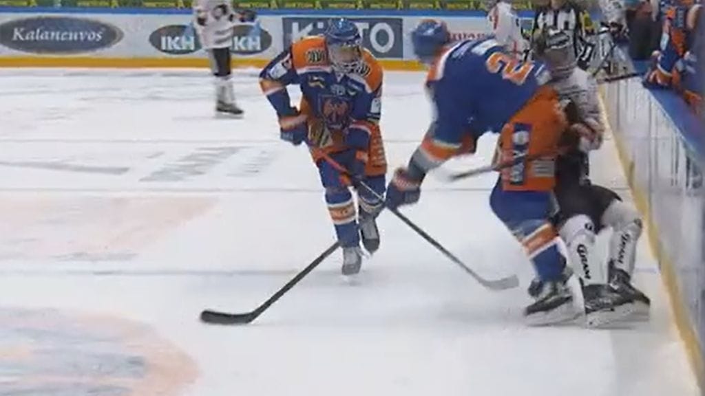 Kiekkoa kuljettaneen Lambertin matka pysähtyi laidan tuntumassa, kun yli 100-kiloinen Blood jysäytti painavan taklauksen JYPin nuorukaiseen.