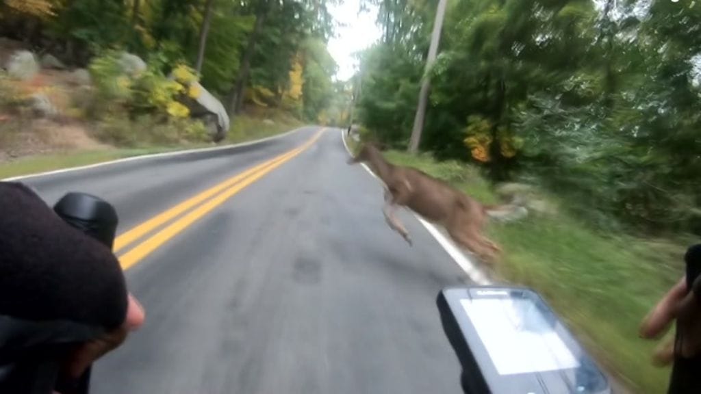 Videolla näkyy peuran loikka suoraan hurjaa vauhtia viilettävän pyöräilijän eteen.