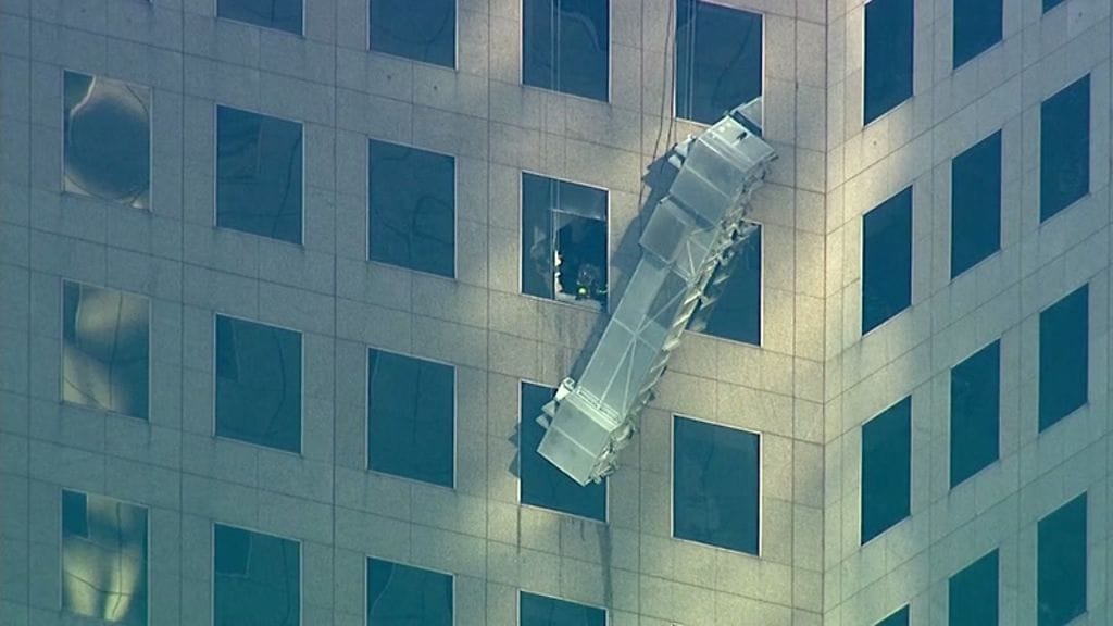 Kaksi ikkunanpesijää joutui pelottavan tilanteen äärelle, kun heidän käyttämänsä teline pilvenpiirtäjän ulkoseinällä rikkoutui Yhdysvalloissa.