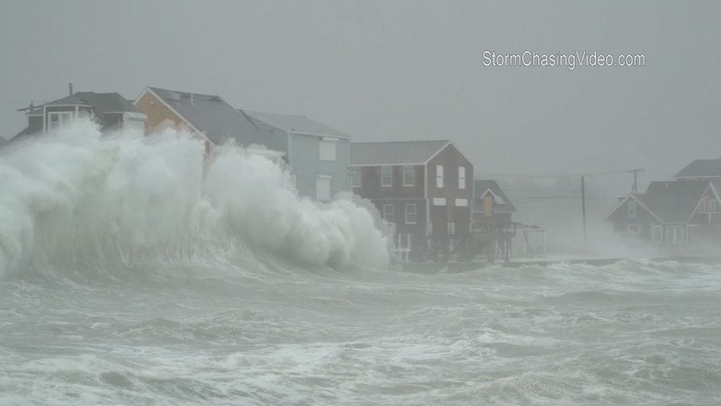 Videolla aallot piiskaavat taloja Scituatessa Massachusettsissa perjantaina.
