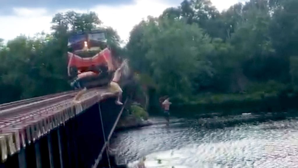 Videolla näkyy, kuinka hyppääjät odottivat sillan reunalla junan lähestymistä. Juna oli vain metrien päässä nuorista, kun he hyppäsivät sillalta veteen.