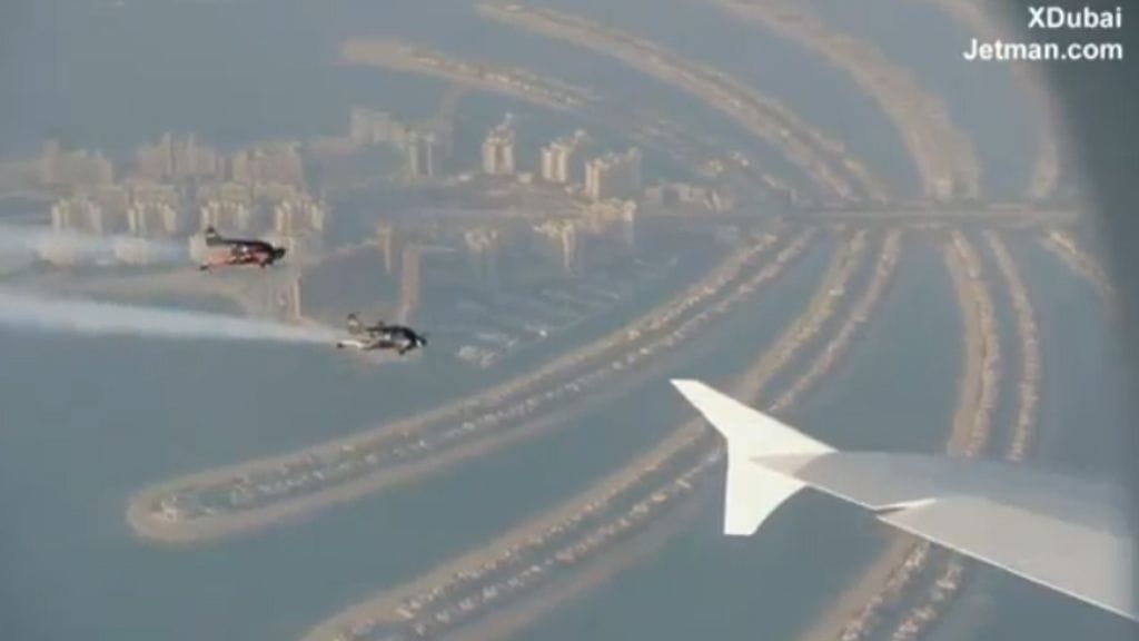 Dubain taivaalla nähtiin lokakuussa vaarallinen temppu, kun mieskaksikko viiletti lentorepuilla matkustajakoneen vieressä.