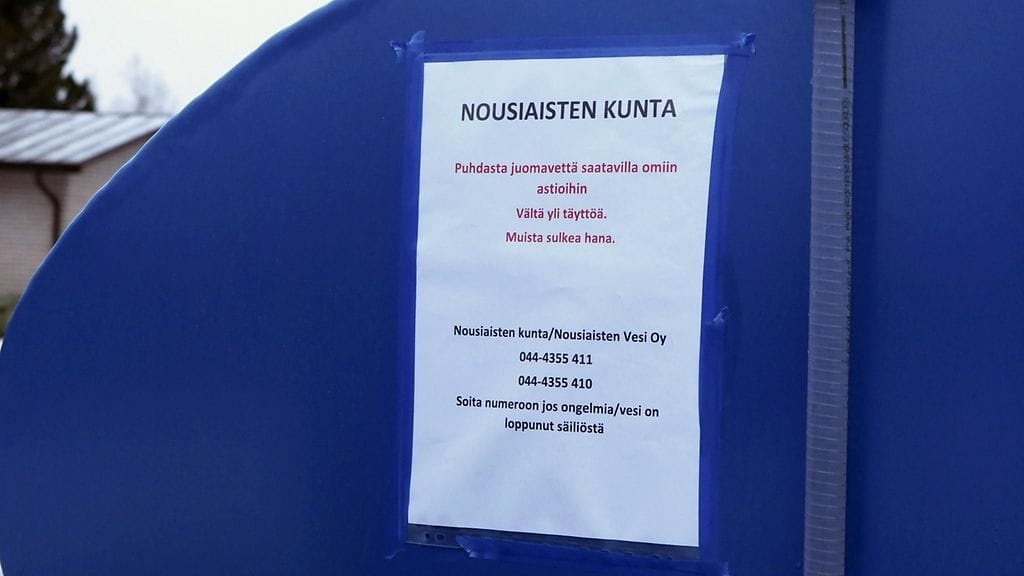 Aamulla vettä Nousiaisten varavesitankilta hakeneita asukkaita ei taatusti naurattanut. Asukkaille järjestetyn juomavesisäiliön hana oli jäätynyt Moisiokodin edustalla, kertoo Turun Sanomat. Hanaa ei saatu avattua heti, joten aikaisin heränneet ihmiset olivat syystäkin pettyneitä.