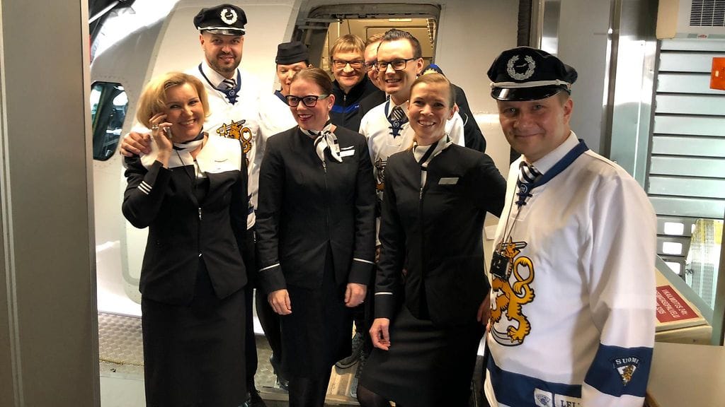 Finnairin lentohenkilökunta oli maajoukkuetta vastassa pelipaitoihin pukeutuneena. Tanskan Billundiin matkanneen lennon kapteenina toimi Aleksi Aho.