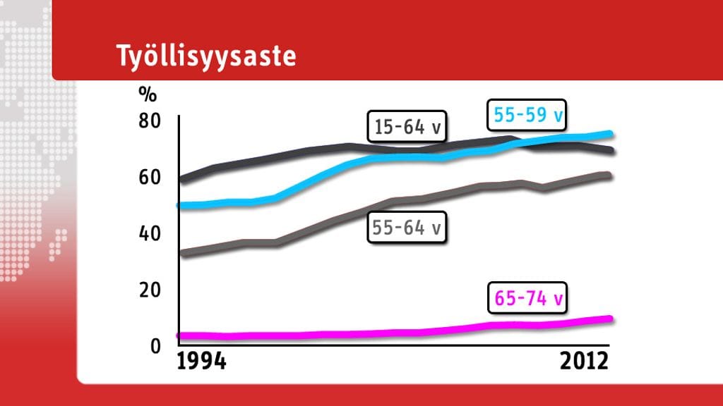 Jos iäkkäiden työllisyysaste olisi sama, kuin laman lopussa vuonna 1994, iäkkäitä työllisiä olisi nyt 200 000 henkilöä vähemmän.